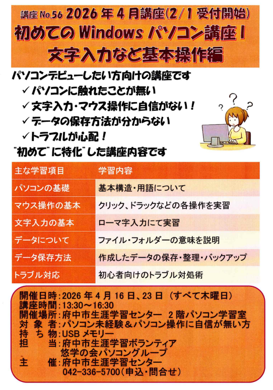 初めてのWindowsパソコン講座Ⅰ~文字入力など基本操作編 日時:2026/4/16、23(木)13:30~16:30 場所:府中市生涯学習センター2階パソコン室